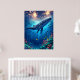 The whale, with its dark skin speckled with white spots, dominates the centre of the image, surrounded by schools of fish of different sizes moving in harmony.