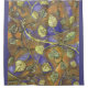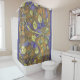 This shower curtain has undulating leaves from a raspberry bush, without the raspberries, in warm yellow greens, moss colour, and loden, plus camel gold, and dark periwinkle, in marker, art by me, Kristie Hubler. Has sold on shower curtains and various other items. Inspired by a velvet fabric covered frame, embroidered with leaves, from the 1940s. I just started doodling with markers, after looking at some raspberry leaves.