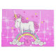 A cute unicorn stands on a colourful rainbow in a pink and sparkly sky.