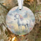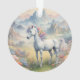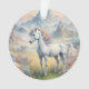 An acrylic ornament showing a dreamy image of a white unicorn with a rainbow mane standing in a field of flowers. In the background are majestic mountains. The perfect gift to give those who love magical and mystical unicorns. Contains generative content.