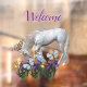 Mystical white unicorn surrounded by pretty butterflies and colourful flowers fantasy animal welcome design by Susan. Please visit my store at Smilin' Eyes Treasures to see more flower, animal, nature, and digital art design cards and gifts for home and office.