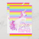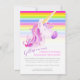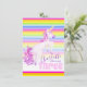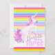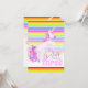 3rd birthday invitations, featuring a cute whimsical unicorn watercolor painting and colourful rainbow stripes. Personalise with your own birthday party details, currently reads, Charlotte is turning three. Gallop on over. Unique drawing, watercolor painting art and graphic design by Sarah Trett www.sarahtrett.com for www.mylittleeden.com