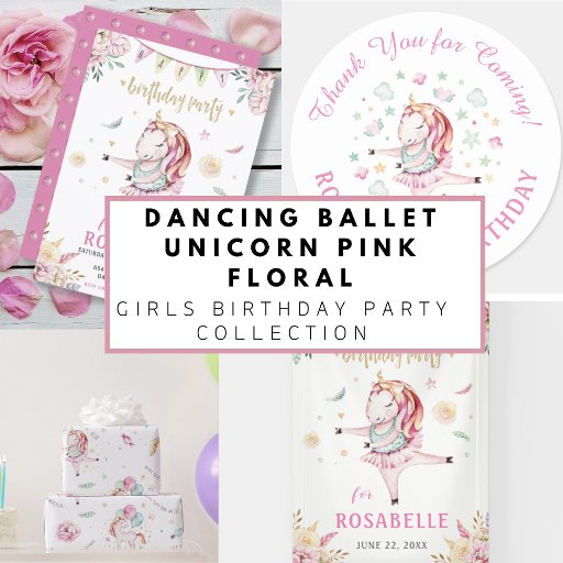 This cute design is sure to please your little ballerina for her birthday party. This invitation postcard design features a pretty unicorn ballerina decorated with pink floral accents, feather, hearts, and a banner that says "Happy Birthday Party."