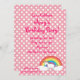 Birthday invitation with unicorn and rainbow pink polka dots pattern