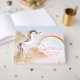 Unicorn birthday party guest book with pretty pastel unicorn on a rainbow and gold cloud background. This beautiful unicorn guest book is easily customised for your event by simply adding the text of your choice in the font style you prefer. You can also change the background colour on this adorable unicorn birthday party guest book. This is a printed design with no real glitter.
