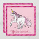 This birthday party invite features a unicorn trotting through the stars. For matching items type "penguincornerstore unicorn" into the Zazzle search bar.