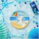 An adorable, blue haired, unicorn playing on the beach with a beach ball. Perfect for a kids beach or pool party.