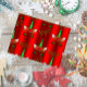 A colourful and festive red unicorn postcard featuring a gorgeous pattern of unicorn faces, with green horns, green eyelids and pretty red poinsettia on their heads. There are golden 'Believe' messages scattered around them, on a vibrant red background. A great Christmas greeting for a unicorn lover.