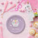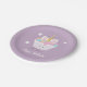 Paper Plate with a smiling, cartoon, unicorn cupcake. The design includes stars and the words "Happy Birthday". The words are customisable. (The gold tone of the unicorn horn is non-foil)