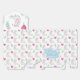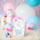 The design is a seamless pattern featuring stylised unicorn heads with flowing, pastel-coloured manes in shades of pink, yellow, and blue, adorned with sparkles. The unicorns have white faces and golden horns, adding to their magical appearance. Scattered around are large pink hearts, as well as pink and yellow flowers with green leaves. All elements are set against a white background, creating a whimsical and dreamy look.