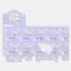 The design features a lavender background with white unicorn heads that have pastel pink, blue, and yellow flowing manes. Scattered throughout are fluffy blue-outlined clouds, pink hearts, and yellow stars. The elements are arranged in a seamless, whimsical pattern. The overall style is dreamy and fantasy-inspired.