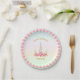 Elegant party paper plate with a cute unicorn, flowers and gold dots on multicolored pastel gradient framed with pink hearts. Ideal party supplies! Ideal for magical birthdays, showers, anniversaries, special occasions and all daily celebrations! Texts can be personalised.