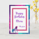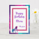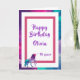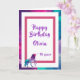 A fantasy unicorn in pink, purple and turquoise for a young girl/teen girl's birthday. One frame in pink, purple and turquoise, another frame with faux pink glitter. Purple letters and the text: Happy Birthday. Templates for name and age. White background colour.