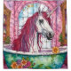 An adorable watercolor unicorn with a pink and purple mane soaks in a tub