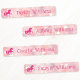 Name labels featuring a pink unicorn and your name on a light pink, soft-focused background with glistening light bokeh.