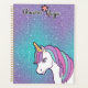 This design shows a cute unicorn with colourful hair and golden horn, standing on a shiny glitter background full of magic
