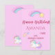 A cute unicorn and a rainbow with stars greeting card. Pastel pink background. Templates for name and year and who it's from. With the text: Happy Birthday! written in dark pink and with faux glitter.
