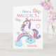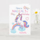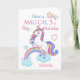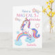 A cute and sweet magical unicorn birthday card design featuring a colourful unicorn standing on a cloud and Rainbow with a background of shooting stars and hearts.The card has the wording - Have a Magical Birthday in a colourful font . A sweet, cute and magical design for a little girl who is turning three years old. A lovely 3rd birthday card for your daughter, granddaughter or niece. Can be personalised by amending the from name at the bottom of the card then change the message inside which currently reads , Have a Magical 3rd birthday, lots of love XX The Age can also be amended.