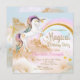 Unicorn birthday party invitations with pretty pastel pink purple and teal blue unicorn and rainbow on a beautiful gold cloud background. This beautiful unicorn birthday party invitation is easily customised for your event by simply adding your event details in the font style of your choice. You can also change the background colour. This is a printed design with no real glitter.