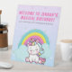 Welcome guests with this sparkling Unicorn Birthday Party Sign! Featuring a beautiful pastel gradient background, gold stars, and a unicorn illustration, it's perfect for entrance tables or dessert stations. Easily personalise the name and age fields to perfectly complement your unicorn invitation and thank-you card.