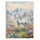 A photo notebook showing a dreamy image of a white unicorn with a rainbow mane standing in a field of flowers. In the background are majestic mountains. The perfect gift to give those who love magical and mystical unicorns. Contains generative content.