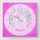 Unicorn Pink Glitter Personalised Name Square Wall Clock