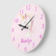 A soft pink background decorated with a cute unicorn face in white and pink. Personalise and add a name, pink letters. Pink clock-face numbers.