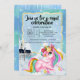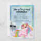 A pretty pink magical unicorn with long gold, blue and pink hair is sitting up in the snow and is framed by fluffy white snowflakes, a castle and faux gold foil frame that has templates for your personalised wording. The back has the same ice blue background filled with icicles and the same princess unicorn wearing a gold crown. These are ideal for little girls birthday celebrations.