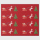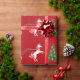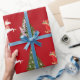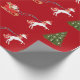 Elegant, minimalist Christmas wrapping paper with a unicorn pulling Santa's sleigh towards a fir tree decorated with silver baubles. The unicorn has a red and golden mane and tail and the sleigh carries Santa along with many gifts. On a Christmas red background.