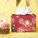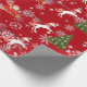 Elegant, modern, festive Christmas wrapping paper with a unicorn pulling Santa's sleigh towards a fir tree decorated with silver baubles. The unicorn has a red and golden mane and tail and the sleigh carries Santa along with many gifts. On a Christmas red background, with many cute snowflakes.