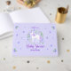This baby shower guest book features a pretty unicorn design with faux purple glitter. Personalise it with a name. This guest book is part of a collection which includes a full range of matching items. Please visit the collection pages in our store to see the full range of products that you can personalise for your baby shower needs.