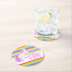 Second birthday party coasters, featuring a whimsical mythical unicorn watercolor painting and colourful rainbow stripes. Personalise with your own choose of name. Currently reads Happy Birthday Abigail two. Unique drawing, watercolor painting art and graphic design by Sarah Trett www.sarahtrett.com for www.mylittleeden.com