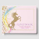 Unicorn birthday party guest book with pretty gold glitter unicorn and hearts on a pink rainbow background. This cute unicorn guest book is easily customised for your event by simply adding the text of your choice in the font style you prefer. You can also change the background colour on this adorable unicorn birthday party guest book. This is a printed design with no real glitter.