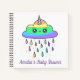 Cute and quirky rainbow unicorn cloud with colourful raindrops on personalised baby shower notebook. Great to use as a guestbook for baby's words of wisdom.