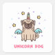 Image By Viaire | Shutterstock. Image ID: 722682502 | This design features a cute pug unicorn with a rainbow horn and wings.