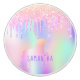 A trendy rainbow coloured background with unicorn and rainbow pastel colours in pink, purple, rose gold, mint green. Decorated with faux glitter drips in rose gold, pink and purple and a rainbow coloured unicorn.  Personalise and add a name, written with a girly modern hand lettered style script.   Purple coloured letters.