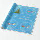 Elegant and cute personalised Christmas wrapping paper with Santa in his sleigh pulled by a unicorn, various snowflakes, and Xmas trees decorated with silver baubles. Perfect for little kids, especially little girls who like unicorns. With the greeting "Merry Christmas!" (which you can customise) in stylish cursive script / calligraphy, along with a custom name. On a blue background.