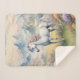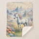 A dreamy image of a white unicorn with a rainbow main standing in a field of flowers on a sherpa blanket. In the background are majestic mountains.The perfect gift to give those who love magical and mystical unicorns. Contains generative content.