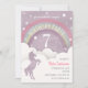 A birthday party invitation featuring clouds, stars, a rainbow, and a purple watercolor inspired background with matching unicorn silhouette.