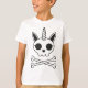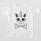 This graphic art piece combines the whimsical and the macabre, featuring a stylised skull with large, expressive eyes, a unicorn horn, and cat-like ears. As seen on Sophie's t-shirt, the skull is accompanied by crossbones, enhancing its playful yet gothic appeal. The design uses a simple black and white colour scheme, which emphasizes the bold and graphic nature of the illustration. This unique blend of elements makes it a perfect choice for those who appreciate a blend of fantasy, dark humour, and minimalist art.