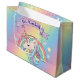 This cute and colourful custom gift bag features a beautiful illustration of a unicorn and pastel coloured rainbow. over a rainbow gradient background. Faux gold glitter accents the top and bottom portions. Little stars in matching colours surround the rainbow. A banner is printed above the unicorn with a sample name printed below in an elegant purple script font. You can personalise the gift bag to include your own custom name or text.