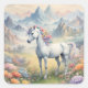 A sticker showing a dreamy image of a white unicorn with a rainbow mane standing in a field of flowers. In the background are majestic mountains. The perfect gift to give those who love magical and mystical unicorns. Contains generative content.