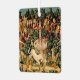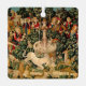 This unicorn tapestry is an enhanced reproduction of the "The Unicorn is Found" tapestry, which is the second tapestry of a series of seven mediaeval tapestries that showcases the mythical unicorn.The series is entitled "The Hunt of the Unicorn" which are also referred to as the Unicorn Tapestries". The tapestries were created from 1495-1505. This Unicorn is Found tapestry shows a group of mediaeval noblemen and hunters, as well as all kinds of ferocious lions and leopards. There is a unicorn at the front, a beautiful white unicorn, which has its horn pointed downward as it kneels. There is a mediaeval fountain between the unicorn and the huntsmen.