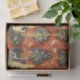 The Lady and The unicorn, a mediaeval tapestry from around 1500, is one of a set of French tapestries, considered great works of art from the Middle Ages. This Lady and the Unicorn tapestry is a stunning image of a lady standing in a tent, with a unicorn on one side of her, and a lion on the other. There's a little white dog sitting on a bench next to her, and a handmaiden on the other side. The tapestry's background is a red field of flowers and animals, including dogs, rabbits, and birds. The original mediaeval Unicorn tapestry was quite damaged and lost much of its original bright colouring and quality. While we were able to restore some of the Unicorn tapestry's original red and blue mediaeval colouring, please be aware that there are still imperfections in the image. However, ours is a unique version of this mediaeval tapestry, as we have extended it and enhanced it to bring out its original beauty.