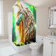 This shower curtain has a unicorn with dreadlocks pictured on it.