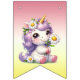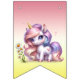 This bunting flag shows three happy unicorns, with daisies, on a gradient background. Text on this image is customisable, and currently says, "Happy Birthday." The image is in pastel colours. Perfect for including at a unicorn-themed event!