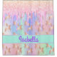 A trendy holographic coloured background with unicorn and rainbow pastel colours in pink, purple, mint green. Decorated with drips in rose gold, pink and purple and a golden coloured unicorn pattern. A mint green band. Personalise and add a name, written with a girly modern hand lettered style script. Purple coloured letters.