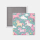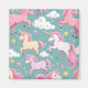 Pink, white and yellow unicorns with clouds and stars on blue background pattern design.