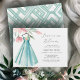 Celebrate in style with these summer invitation designs, perfect for honouring the bride-to-be. These unique bridal shower invitations feature an elegant gown illustration adorned with dusty pink flowers, painted in soft watercolor shades of sage blue. The reverse side showcases a delicate lattice pattern in coordinating blue, adding a refined touch.