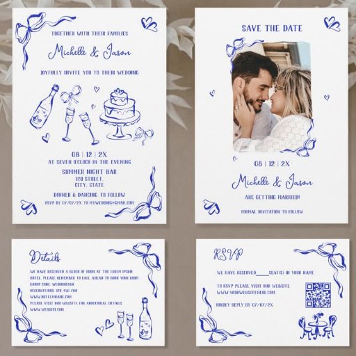 Unique blue Hand Drawn Contemporary Retro French Fun Invitation with a bow frame, a whimsical trendy artwork for your french wedding by Savanamm
